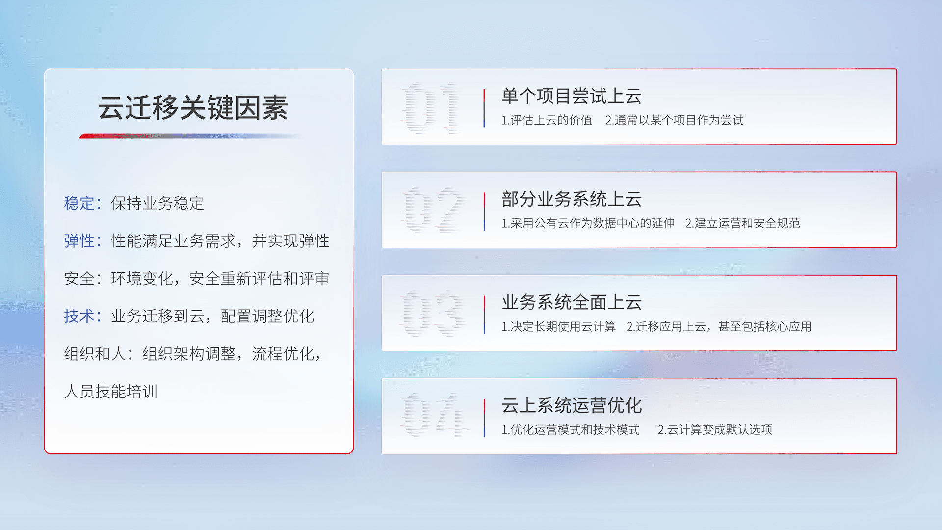 结合实际业务,,,,从规划设计、、、、云平台选型、、云原生改造、、、数据迁移、、、集成交付,,,迁移全过程为客户识别最佳上云路径,,,,做好风险识别管理,,,设计网络架构、、、身份权限、、、安全审计合规、、、操作审计、、、、日志审计、、监控告警策略、、、、多站点容灾设计等,,,,对云上基础设施进行整体规划,,提升IT治理水平,,以满足弹性、、、、高可用、、高性能的需求。。。