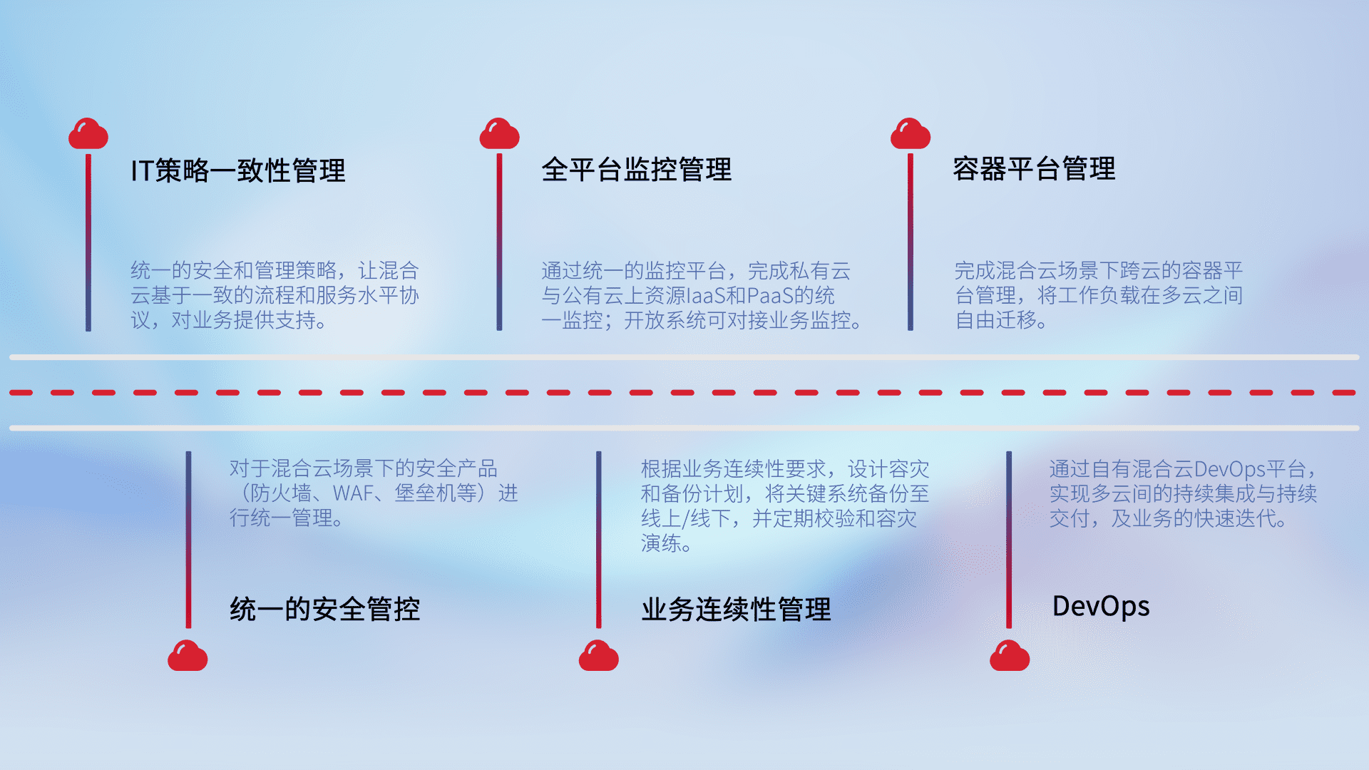 通过多云纳管,,以统一的资源数据模型把客户的云资源进行抽象和封装,,进而实现对多云资源的统一操作,,,保障云资源管理的可靠性、、、、稳定性与可用性。。。。量身定制化运维内容,,配置、、、、开发运维、、补丁管理、、、、备份、、、、监控、、、、认证和访问管理、、审计和日常巡检等,,,保障在用云过程中的可靠度,,,,稳定度以及高可用率。。。。