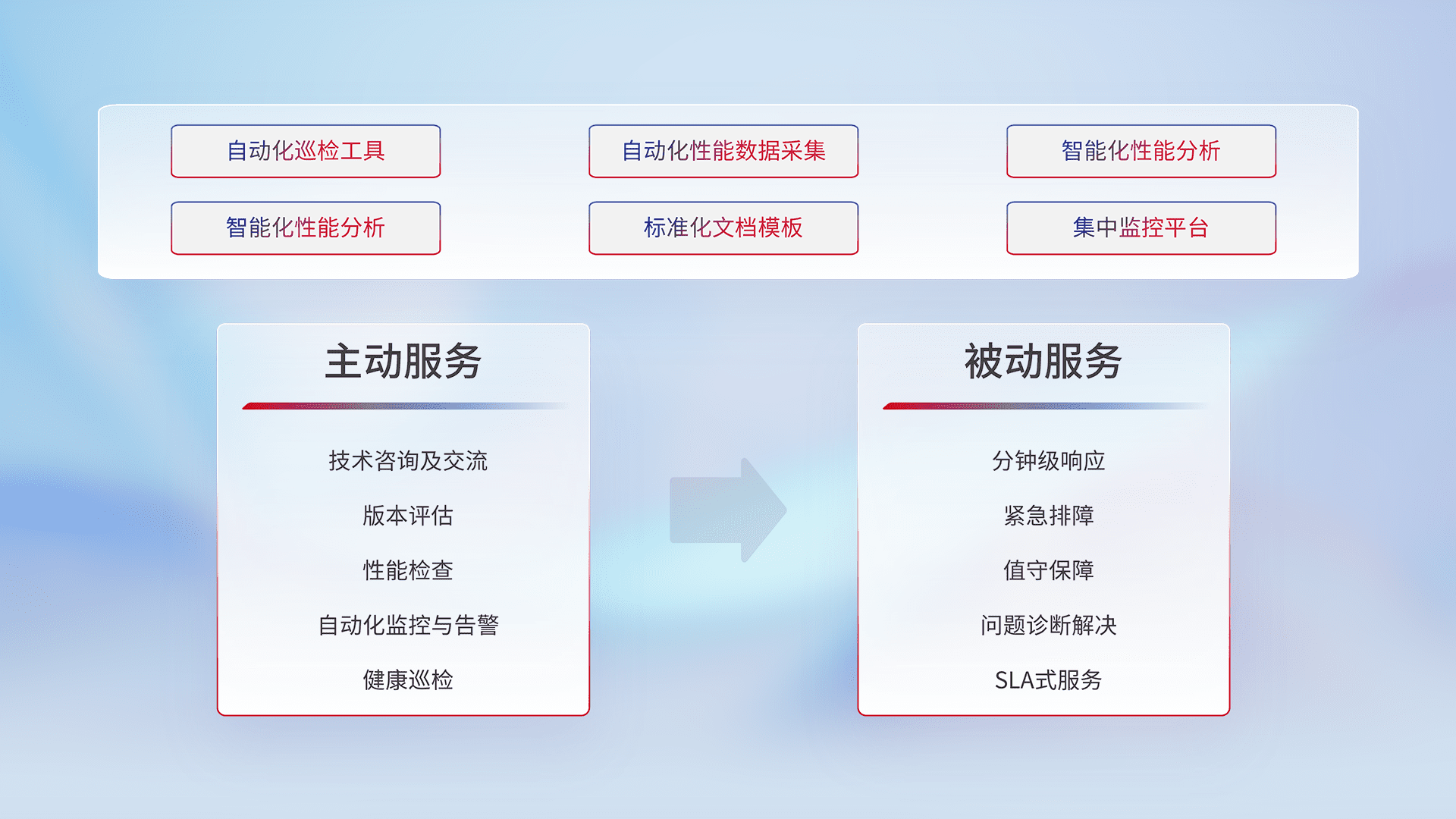 智能化工具和标准化文档,,,,保障服务质量,,提供主动服务(包含技术咨询、、、、版本评估、、性能检查、、自动化监控与告警、、、健康巡检)和被动服务包含(分钟级响应、、、紧急排障、、、值守保障、、、问题诊断解决、、、、SLA服务)。。
